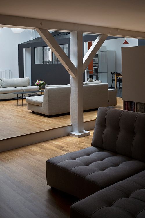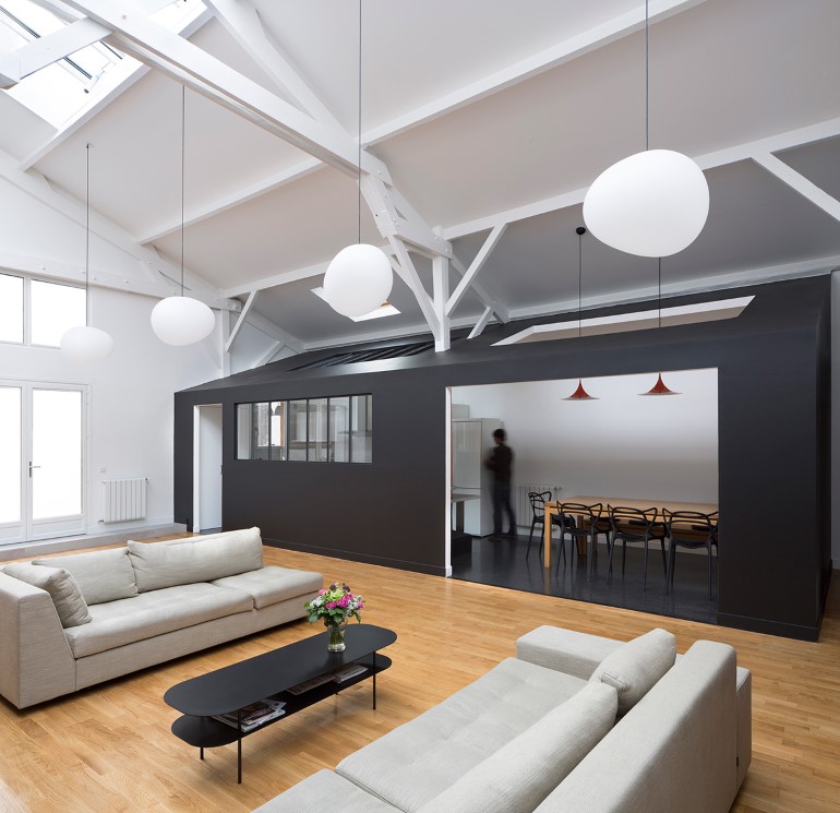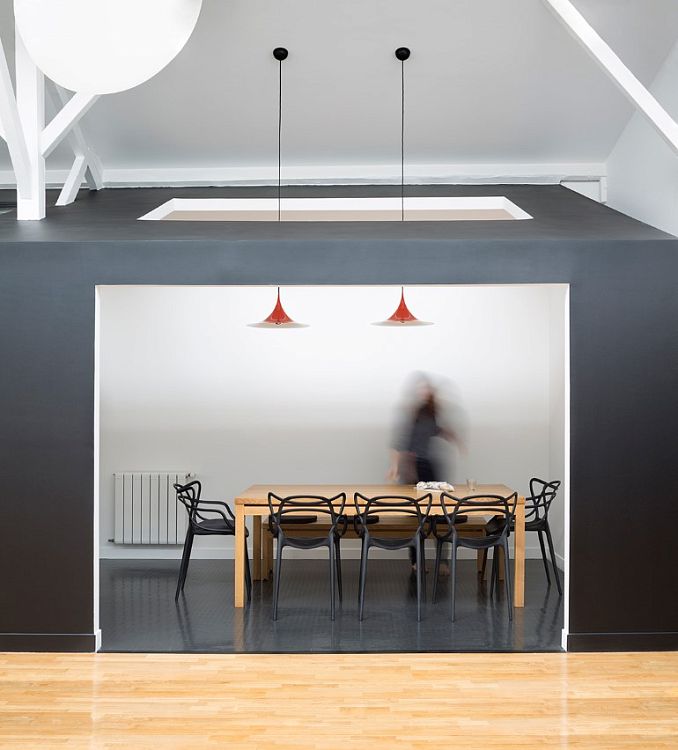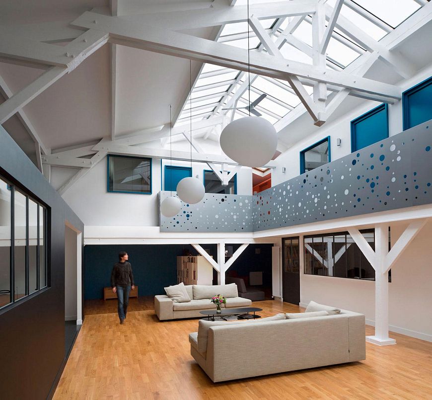 Особенно выделяется столовая первого этажа, похожая на плотницкую мастерскую в миниатюре, оформленную в темных тонах. Несмотря на обилие стальных конструкций и индустриальную стилистику, лофт получился уютным.