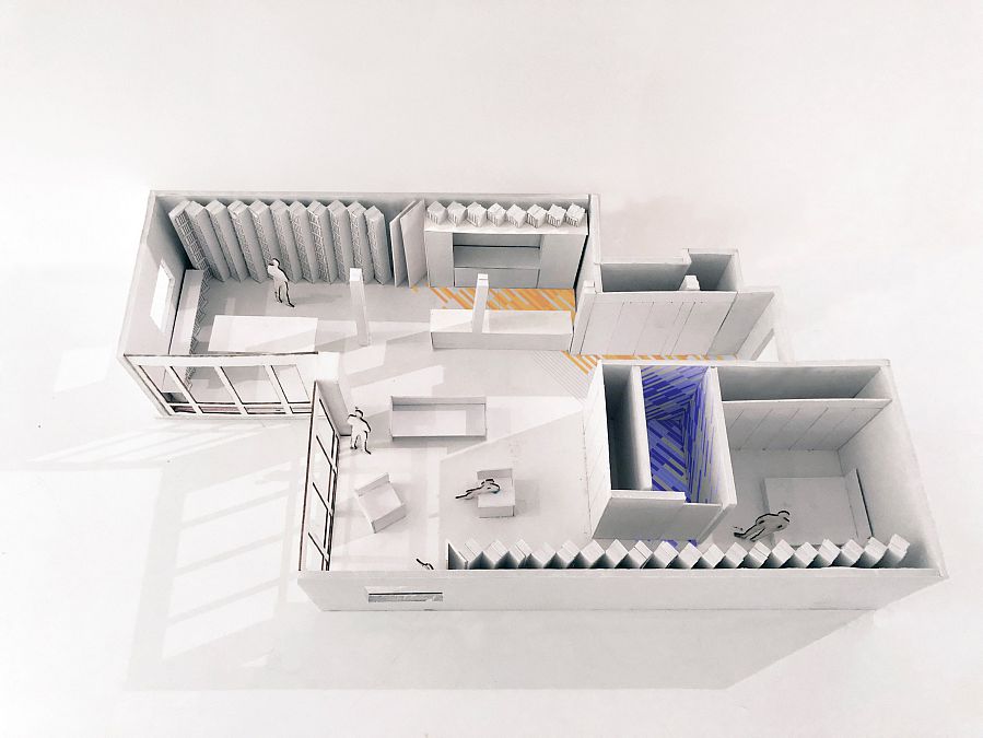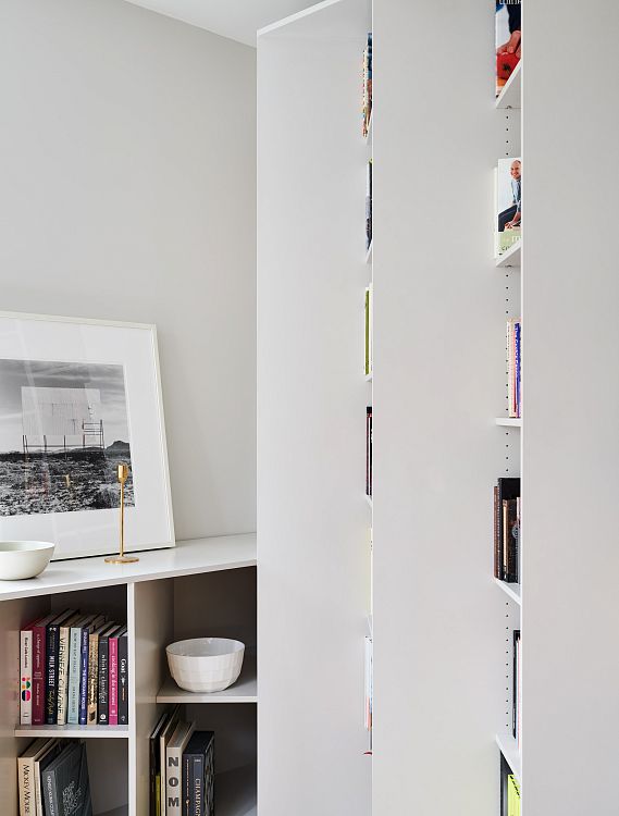 В американское бюро Koray Duman обратилась семейная пара, которая занимается издательским бизнесом, с просьбой осуществить реконструкцию их бруклинского лофта и придумать, как можно рационально разместить в квартире 2 500 книг из домашней библиотеки. «Мы приняли решение «обернуть» жилище площадью 111 кв.м изнутри по периметру системой хранения с полками, установленными под углом 45 градусов. Это позволяет видеть названия книг с определенной точки. Из других точек обложки не просматриваются», — вспоминают авторы проекта.
