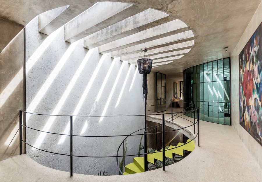 Основным материалом проекта стал полированный бетон. В качестве контрастного материала было выбрано полированное стекло. Из него сделаны перегородки приватным помещений. Таким образом архитекторы достигли двух целей. Во-первых, обеспечили неприкосновенность частной жизни в довольно открытом доме. Во-вторых, обеспечили «солнечный» декор интерьера, наполненного причудливыми отражениями и мерцающими бликами. Не случайно мексиканский проект называется «Калейдоскоп».