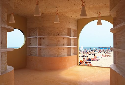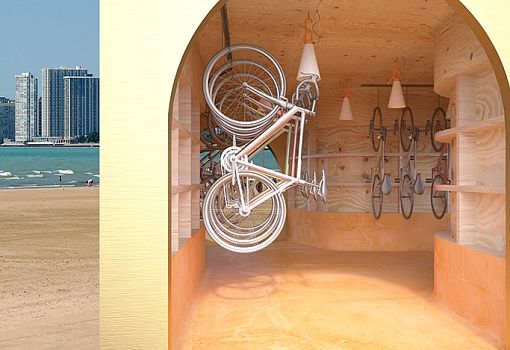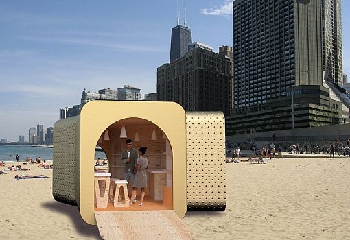 Миланская архитектурная фирма argot ou la maison mobile (AOUMM) представила необычный киоск, который планирует установить у озера в Чикагском Миллениум-парке. Дизайн объекта сочетает в себе промышленные компоненты с индивидуальными элементами, например, изогнутой балкой; алюминиевая облицовка отличает его от традиционных объектов прибрежной полосы. Киоск изготовлен из клееной ламинированной древесины. Крыша сделана из фанеры, а в качестве напольного покрытия используется резина. «Шипованные» алюминиевые элементы обивки делают поверхность «антивандальной». От центральной точки киоска наружу ведут три выхода, что обеспечивает свободу передвижения. При желании киоск может быть превращен в магазинчик одежды или продуктовую лавку, небольшое выставочное пространство, пункт проката спортинвентаря.