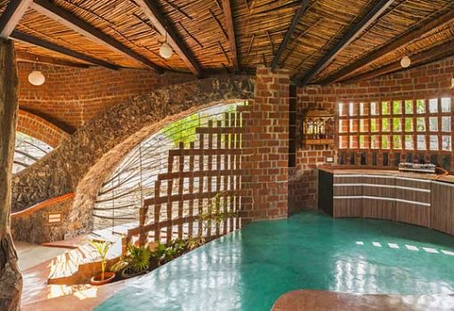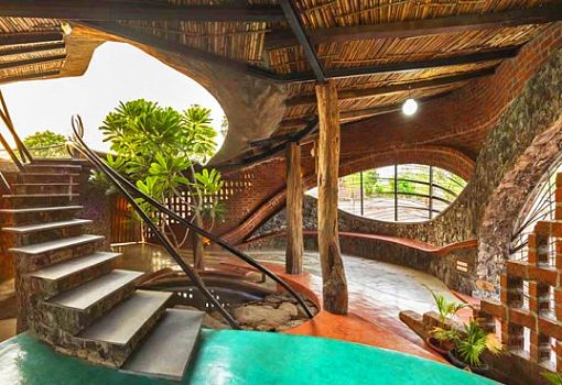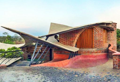 В Мумбаи (Индия) буквально из земли выросло кирпичное сооружение. Интегрированный в окружающий ландшафт дом площадью в 750 кв.м. словно бы сошел с полотен художников-фантастов. Природные мотивы в архитектуре прослеживаются в динамичной форме фасада и изгибах кровли; композиционным центром сооружения стал небольшой внутренний сад с водоемом. Для своего творения iStudio Architecture использовали сталь, бетон, кирпич, камень и некоторые местные строительные материалы. Многочисленные отверстия в стенах обеспечивают естественную вентиляцию.