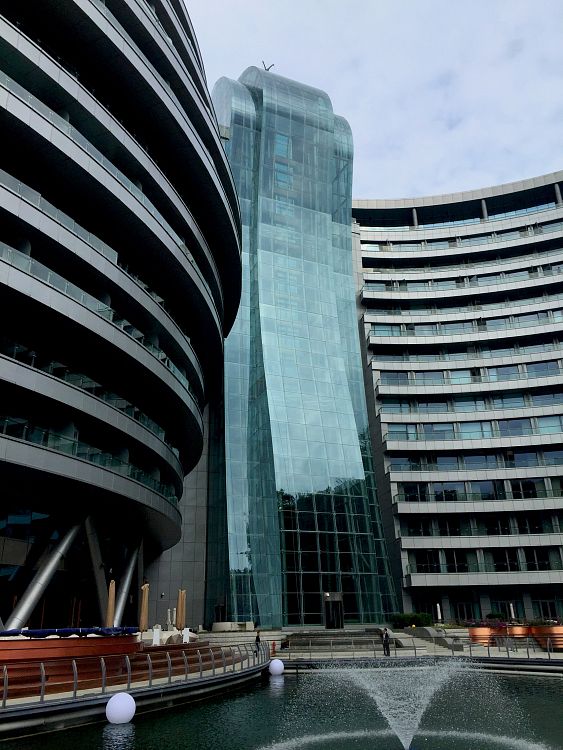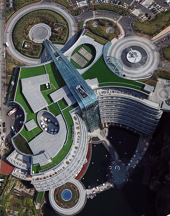 По словам авторов проекта, концепция состоит из трех основных элементов, определяемых особенностями рельефа и местоположения объекта. Это «зеленый холм», то есть, эксплуатируемая и озелененная кровля; «висячие сады» - изогнутые S-образно секции для гостей с номерами, и центральный стеклянный «водопад» - та часть здания, в которой оборудованы панорамные лифты, обеспечивающие доступ ко всем этажам.