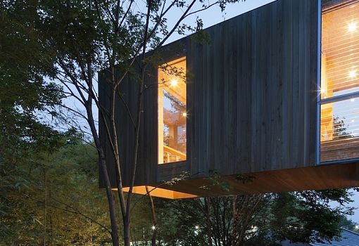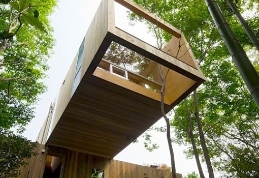 Архитекторы бюро UID Architects создали дом в Японии, который ориентирован на единение с природой. Верхний объем здания вынесен в виде длинной консоли в сторону леса и спроектирован таким образом, что сквозь него прорастают деревья. Значительные по площади окна позволяют обитателям дома наслаждаться живописными видами, открывающимися из помещений второго этажа.