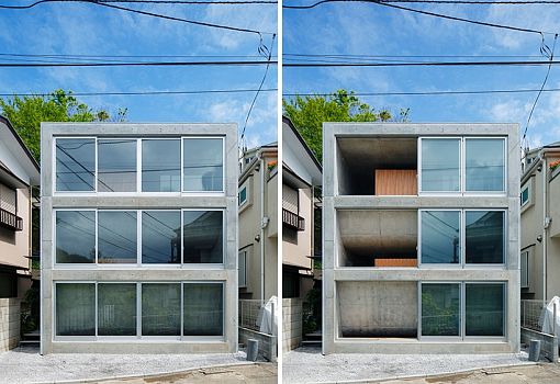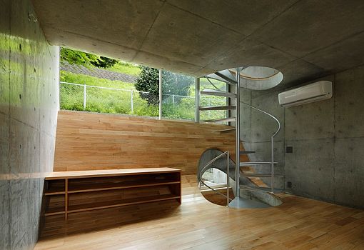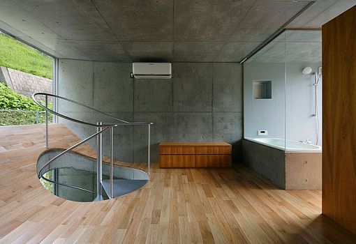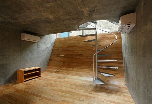 Неожиданный прием использовал японский архитектор Такеши Хосака при проектировании своего объекта – частного жилого дома в Йокогаме. Бетонные перекрытия здания изогнуты и вписаны в большие оконные проемы. Изнутри они отделаны деревом и напоминают скругленные стены с раздвижными стеклянными вставками наверху. Таким образом, границы уровней размываются, и пространство приобретает новые качества. Общее впечатление усиливает винтовая лестница, рассекающая изогнутые плиты перекрытий и соединяющая все этажи здания.