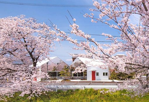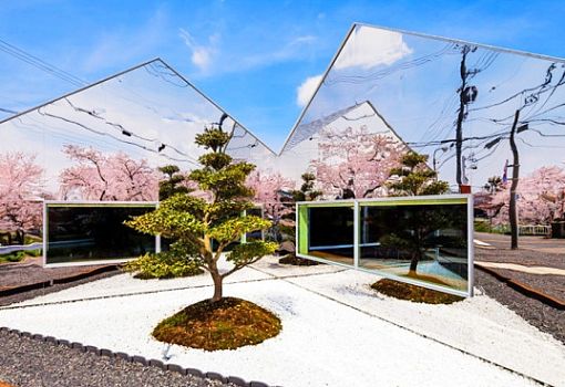 В городе Гифу (Япония) есть кафе, в прямом смысле слова отражающее красоты окружающего мира. Два объема со скатными кровлями развернуты друг к другу под углом, а торцы их покрыты зеркальным стеклом. Кажется, что большой дом был «разрезан» на два маленьких. На площадке, образовавшейся после «разреза» разбит традиционный японский сад. Авторы дизайна из бюро Bandesign утверждают, что самые красивые картины на фасадах появляются в пору цветения сакуры.