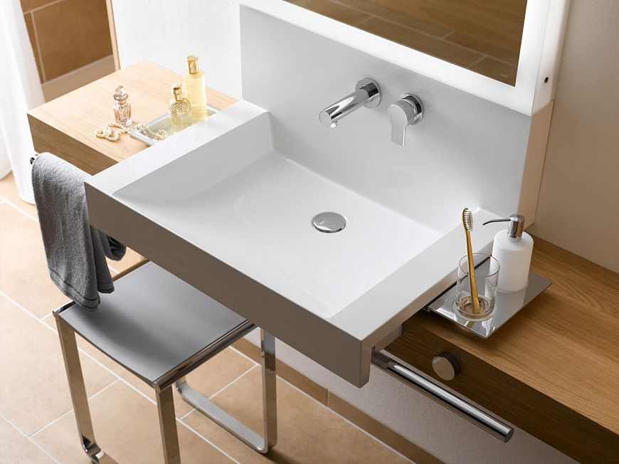 Смесители для умывальника и смесители для биде отличаются тонкой ручкой управления. Боковое расположение рукоятки в деталях доказывает особое преимущество в использовании, так как в случае перекрывания воды мокрыми руками излив смесителя остается сухим и чистым.