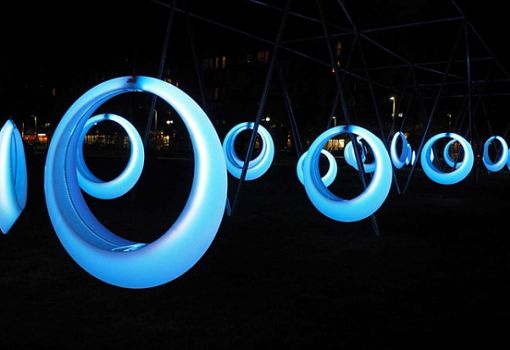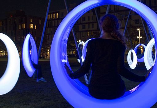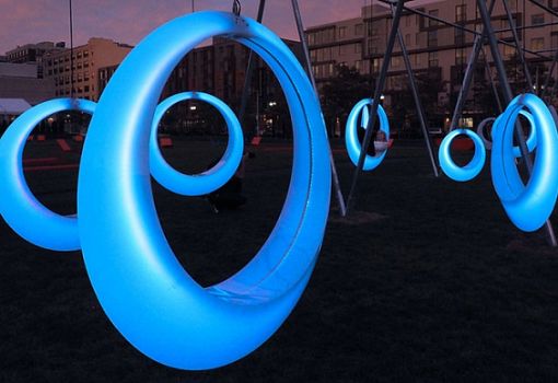 Функциональная инсталляция от бюро Hweler + Yoon Architecture находится в Бостоне. Два десятка полипропиленовых колец выполняют роль неординарного вида качелей. Визуальная составляющая помимо футуристической формы подчеркнута встроенным светодиодным LED-освещением в фиолетовых тонах.