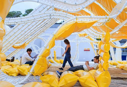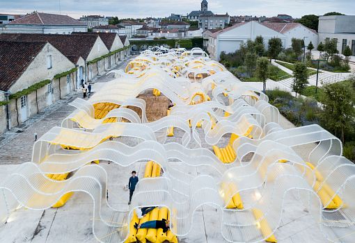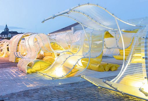 Архитекторы испанской студии SelgasCano представили свою первую работу во Франции - временный павильон, спроектированный по заказу известного алкогольного бренда. Павильон состоит из 30 рядов волнообразных стальных конструкций с использованием полупрозрачных «мембран» от бренда Onduline. Под арками располагаются желтые наполненные водой подушки, на которых с комфортом могут устроиться посетители павильона.