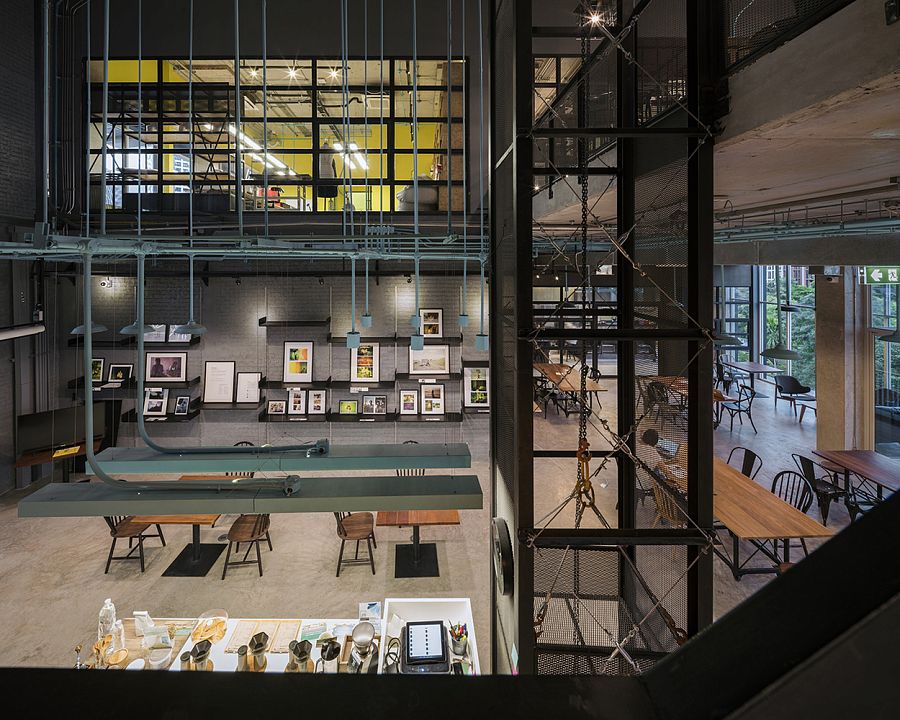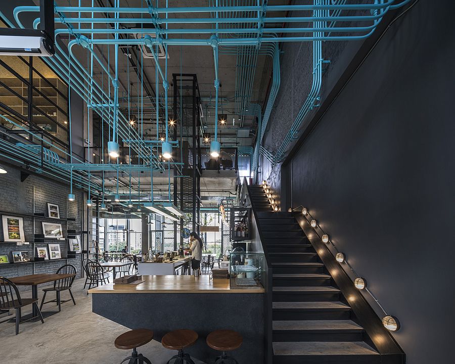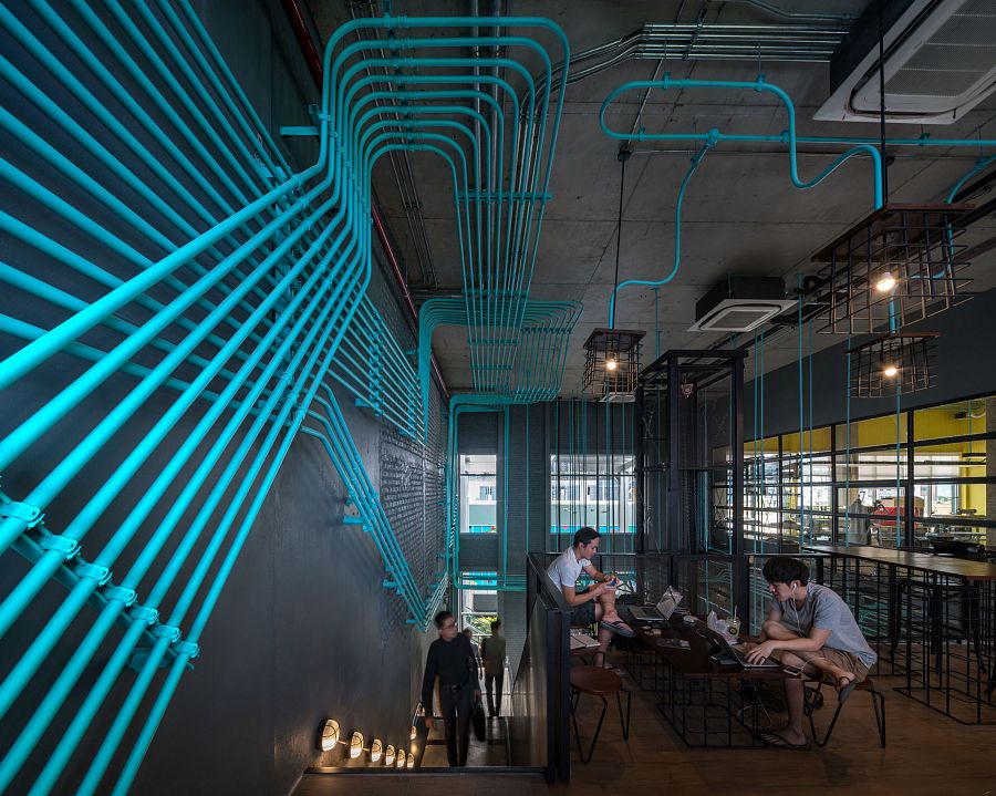 Система освещения и каналы с проводкой в интерьере объекта бюро Supermachine Studio стали композиционным центром. Динамичная инсталляция выделена бирюзовым цветом и образует целую сеть завораживающих линий, пересекающихся во многих точках.