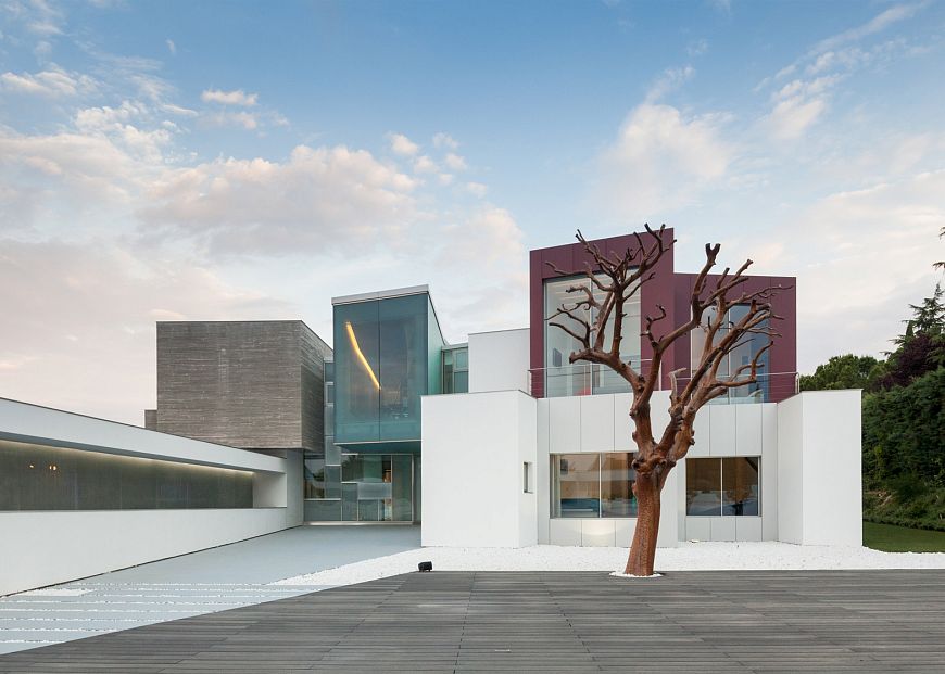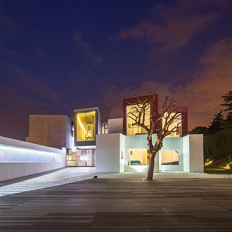 Созданный образ в виде хаотичного набора объемов не случаен, так как он позволяет создать множество укромных уголков во внутреннем дворе и в интерьере. В проекте использованы энергосберегающие технологии – от естественного освещения и вентиляции до геотермического отопления. Общая площадь 1300 кв.м.