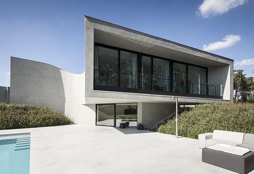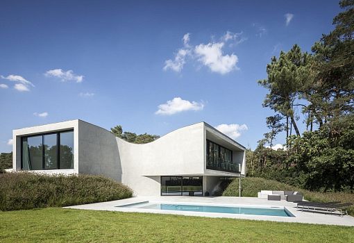 Вилла MQ в Бельгии демонстрирует контраст в архитектуре. Фасад, выходящий на улицу, выполнен в виде глухой волнообразной стены, бережно сохраняющей в неприкосновенности privacy владельцев. Практически все остекленные проёмы обращены во внутренний двор. Пластически выразительная бетонная конструкция разработана архитекторами Office O architects. Вилла акцентирует на себе внимание на фоне окружающего зеленого массива.