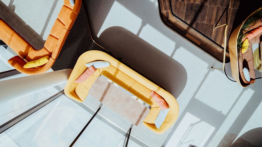 Первый этаж здания получил название «Гея» в честь древнегреческой богини Земли. Здесь запроектированы диванные группы и лаунж-зона, насыщенная растительностью. Для оформления нижнего уровня авторы выбрали «земляную» гамму с яркими ржаво-красными пятнами. «Мы старались выбирать натуральные оттенки, характерные для пустыни, окружающей космодром. Также использовали «пустынные» формы. К примеру, шезлонги, установленные вдоль остекленного фронта, своими скругленными очертаниями напоминают песчаные дюны», – рассказывают архитекторы. В глубине помещения расположен кухонный остров со столешницей из темного оникса, за которым персонал собирается на чашечку кофе. Поверхность из оникса символизирует оазис в засушливой местности. Входная зона соединена с фойе дорожкой из светодиодных интерактивных экранов, на которых отображаются космические виды либо полезная текстовая информация.