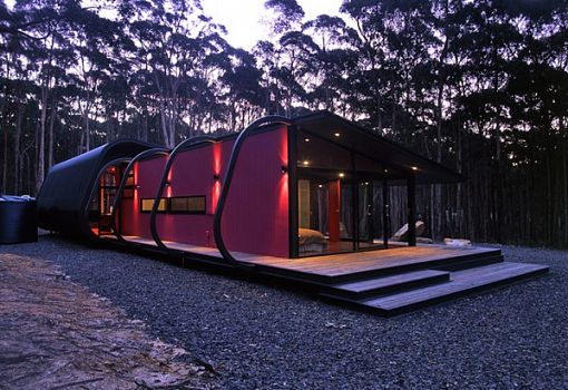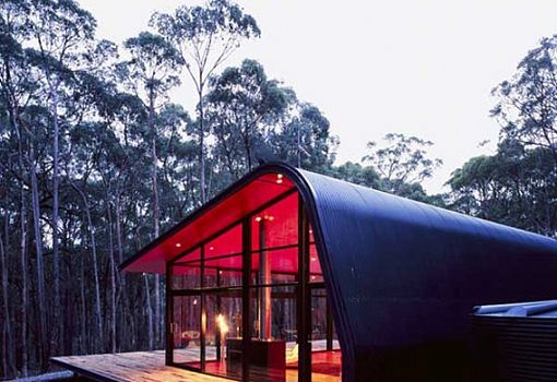 Дом под названием Wheatsheaf находится в Виктории (Австралия) на территории эвкалиптовой плантации. Динамичная конструкция в экстравагантном цветовом исполнении была отстроена Judd Lysenko Marshall на месте старой конюшни (1830 год). Свернутое «полотно» фасада полностью застеклено с одной стороны – этот прием помогает подчеркнуть контраст черного экстерьера и ярко красного интерьера (окрашеной фанеры). В ночное время со включенной подсветкой здание напоминает огнедышащий уголь.