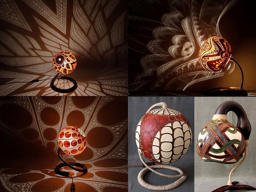 Светильники из африканских тыкв лагенарии. Польский мастер Пржемеке Кравчински. Он не создает лампы по индивидуальному заказу, так как ценит свободу творчества. Лампы можно купить только непосредственно у их создателя через его сайт, они не выставляются в галереях и других интернет - магазинах.