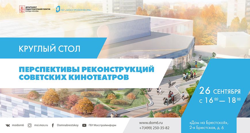 26-го сентября в «Доме на Брестской» состоится завершающее мероприятие деловой программы выставки «Реконструкция советских кинотеатров Москвы» - круглый стол «Перспективы реконструкций советских кинотеатров». Приглашенные эксперты вспомнят интересные решения ранних конкурсов концепций по редевеломпенту районных кинотеатров, изучат положительный опыт модернизации похожих объектов – например, Домов культуры, - выскажут свои опасения и страхи, наконец, «выпустят пар», если такое будет необходимо. «Свободный микрофон» будет включен в этот день в «Доме на Брестской». Начало дискуссии – в 16:00 (регистрация – с 15:30).