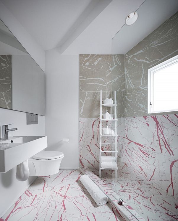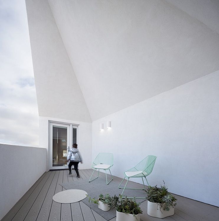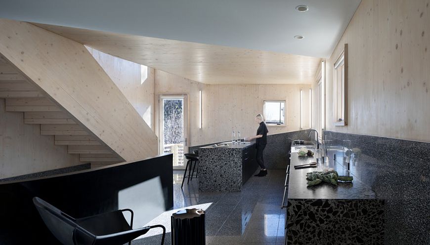 В цоколе дома обустроен гараж, помещение для стирки и бойлерная. На первом этаже архитектор запроектировала отделанную черным мрамором современную кухню, столовую и гостиную. На втором находятся две спальни с ванной комнатой, открытая терраса и кабинет.