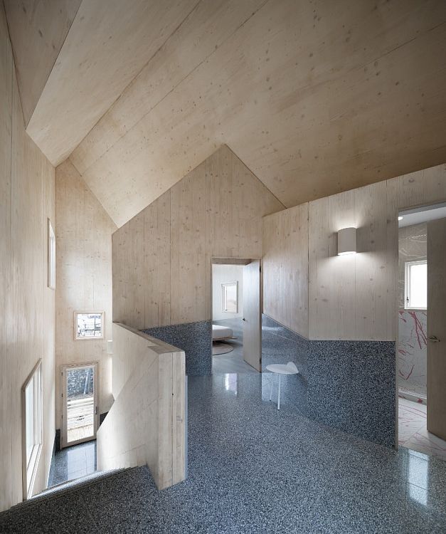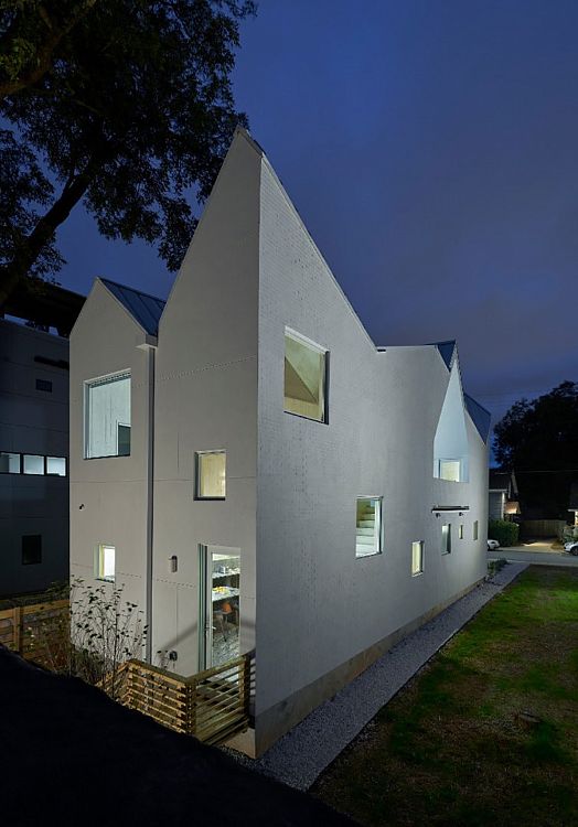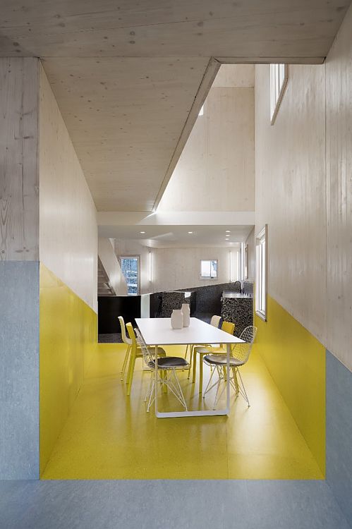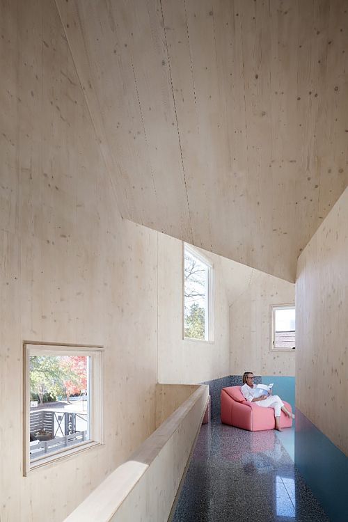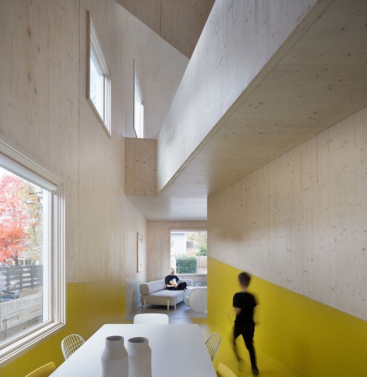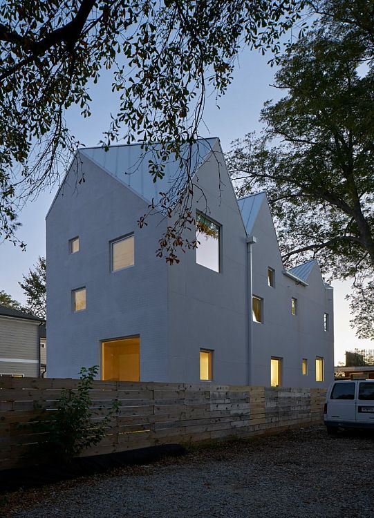 Ширина здания, на постройку которого хватило 87 многослойных клееных панелей CLT, составляет всего 5,5 м. Его отличительная особенность — кровля с шестью скатами и изломами. По признанию автора, была проведена большая работа по изучению конструкции кровель на американском Юге. И даже планировка в этом проекте стала «заложницей» крыши. Еще одна деталь: благодаря использованию CLT здание удалось возвести на месте за 14 дней.