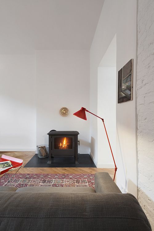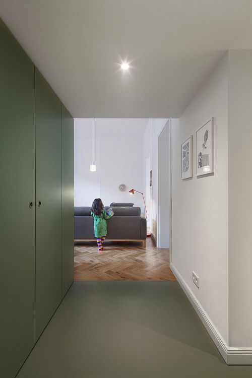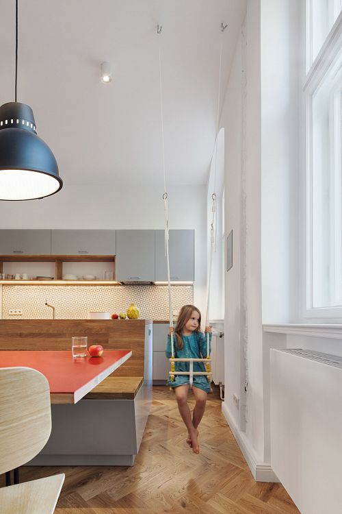 Простор для игр, большие шкафы для тысячи мелочей и использование предметов-сюрпризов – вот три кита, на которых держится дизайнерская концепция. Одним из основных контрастных цветов в этой квартире площадью 90 кв.м стал серо-зеленый (оттенок шалфея). В этот цвет выкрашены все системы хранения и пол в прихожей. Зеленый появляется также и в ванной комнате в виде оливковой керамической плитки. В кухне стены светлые, а мебель светло-серая. Другие цвета появляются только в виде пятен (красная поверхность стола, плитка с узором на рабочей поверхности стены). Также на кухне подвешены к потолку качели – тот самый предмет-сюрприз.  Какие еще интересные предметы и элементы пространства можно назвать? Отреставрированный исторический паркет в игровой, многофункциональный ступенчатый стеллаж, чугунная дровяная печь, «суставчатая» напольная лампа, скамья на кухне, совмещенная с системой хранения.