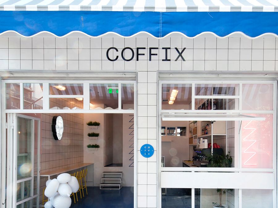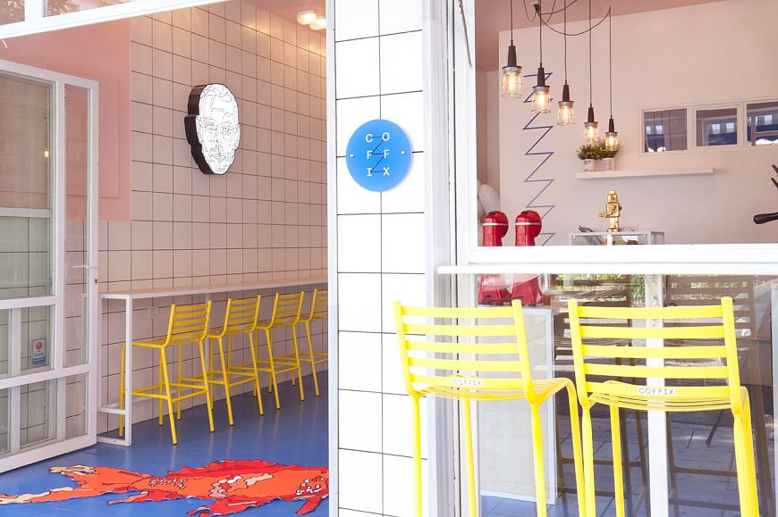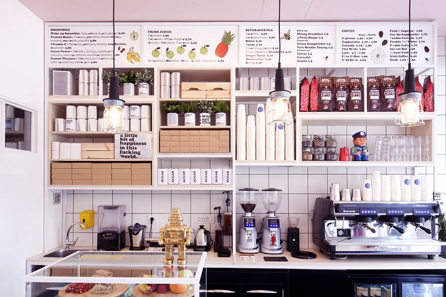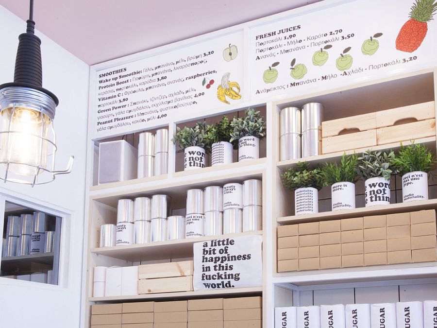 Дизайнеры бюро Studiomateriality спроектировали интерьер небольшого кафе в Афинах, ориентируясь на эстетику комиксов, выражение «кофе всегда сделает день» и образ «лаборатории радости». Для отделки были выбраны ярко-белая глянцевая плитка, розовая (потолок и частично стены) и голубая (пол) краски.