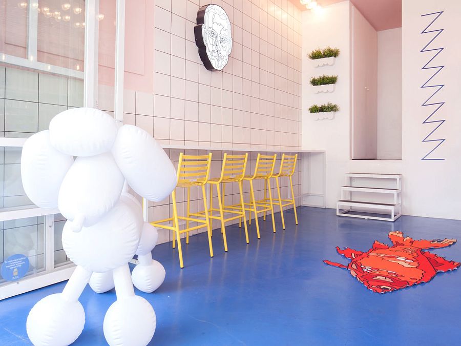 Немного игрушечная эстетика поддерживается мелкими, но примечательными деталями. К примеру, дизайнеры спроектировали для персонала футуристическую форму – особенно впечатляют белые комбинезоны. Кроме того, лайтбоксы – это тоже работа сотрудников Studiomateriality. Эти конструкции призваны развлечь посетителей в то время, как они пьют свой кофе.