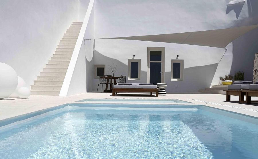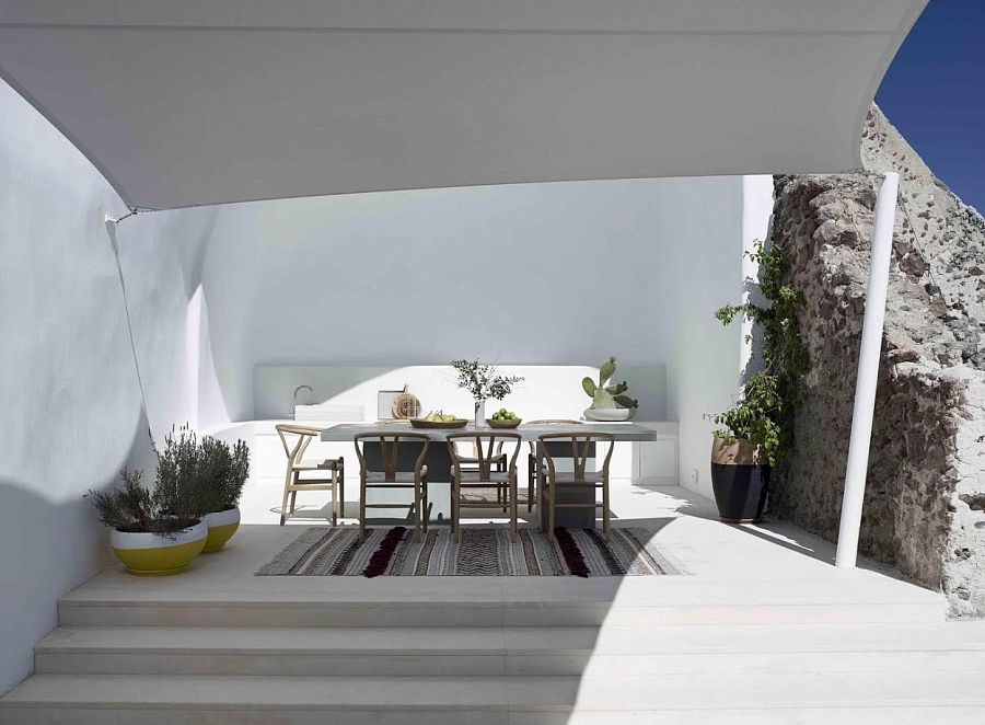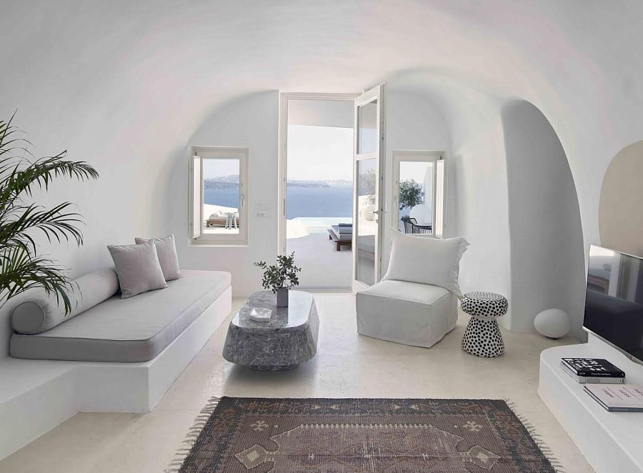 Изогнутая лестница соединяет все уровни постройки с главным двориком и зоной бассейна. Внутри «дома-пещеры» запроектированы гостиная, маленькая кухня, две спальни, хамам и сауна. При строительстве были использованы такие материалы, как вулканический камень, белая штукатурка и светлый мрамор. Так получилось это не совсем типичное средиземноморское жилище.