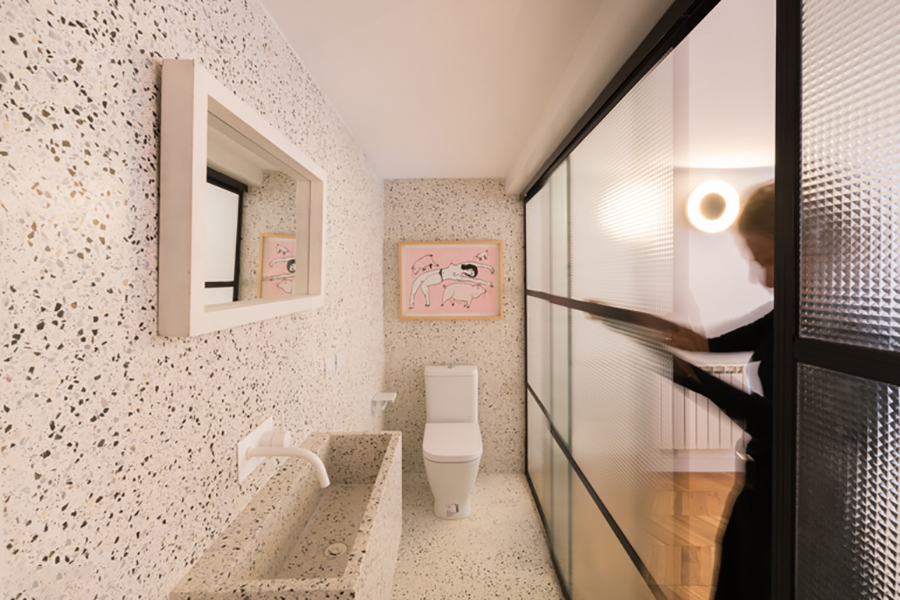 В результате реконструкции были демонтированы все оштукатуренные межкомнатные перегородки на нижнем уровне. Архитектор запроектировала единый объем, вмещающий лестницу, кухню и санузел. Спальня в новой планировке расположена на антресоли и отделена от ванной комнаты раздвижной панелью из протравленного стекла. Кроме того, место удалось сэкономить благодаря превращению лестницы в полноценную систему хранения.