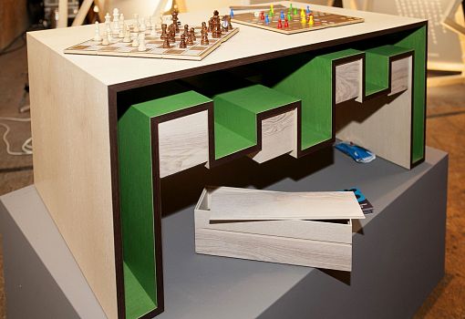 Модель Spielunke вполне может служить и обеденным, и письменным столом, но ее  основное предназначение –  стол для настольных игр. Под его столешницей  располагается система открытых отсеков и выдвижных ящиков, в которых удобно хранить элементы настольных игр – игровые поля, фишки, кости, карточки монополии,  костяшки домино, шашки-шахматы и прочие рассыпные компоненты. В основе изделия – легкая древесина сейбы, отделка – шпон ясеня, углы окантованы кленом и венге. Разработавшая Spielunke группа учащихся рассчитывает, что при наличии такого стола друзья-приятели предпочтут реальные встречи виртуальному общению в сети.