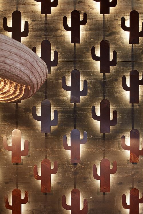 Авторы выбрали яркую палитру цветов для элементов декора (листовой металл, рисунки, керамическая плитка) и мебели. Конечно, не обошлось без сомбреро и кактусов. В виде знаменитой южноамериканской шляпы с полями выполнены,