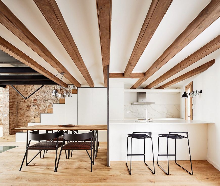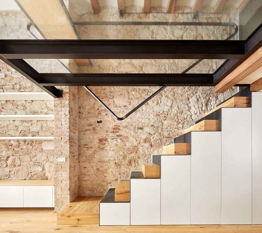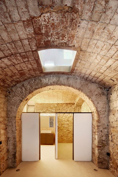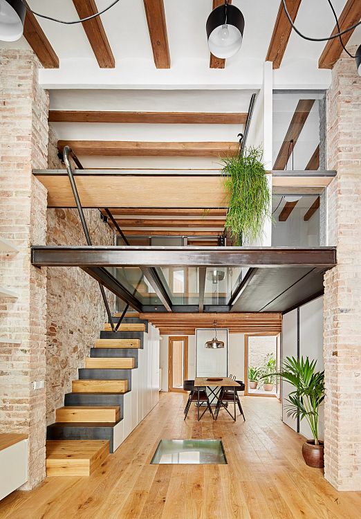 Трехуровневое складское помещение было построено из кирпича в начале XX века, пережило несколько авиаударов в ходе гражданской войны в Испании и годы запустения. «Заказчики, молодая пара, поставили передо мной задачу улучшить качество этого жилища, создав гибкие в функциональном отношении помещения, которые не похожи на комнаты в обычном понимании», - рассказывает Альвареда. Какие же изменения произошли в результате реконструкции? В задней стене цокольного этажа строители проделали два отверстия, оформив их в виде арок. Так появился небольшой открытый внутренний двор, перекрытый решетчатой конструкцией. Часть перекрытия между верхним и первым этажами демонтировали: в образовавшемся проеме смонтирована лестница, ведущая в главную спальню. Кроме этого, стеклянные панели вмонтированы в пол гостиной. В доме появился новый дубовый паркет, встроенные системы хранения и другая мебель.