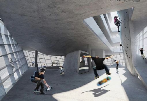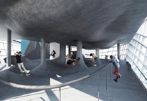 Архитекторы Guy Hollaway Architects задумали уникальный проект – первый в мире многоэтажный скейт-парк. Здание футуристического вида из стекла, металла и бетона сможет предоставить пространства для любителей активного отдыха и спорта в Кенте (Великобритания). Объем сооружения отличается плавностью форм и текучестью в сочетании с энергично очерченными, динамичными элементами.