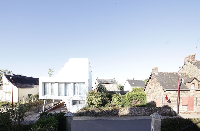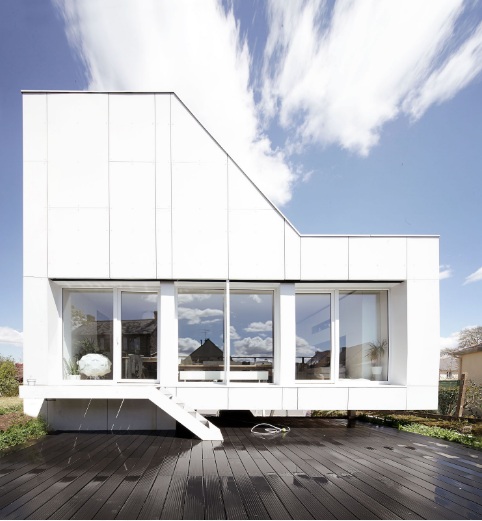 Минималистский дом во Франции построен в виде многогранника, который, как кажется, вот-вот воспарит над землей. Форма его не случайна, так как консоль второго этажа образует навес парковки, а угловатая кровля – террасу. За счет большой площади остекления достигается эффективная инсоляция.