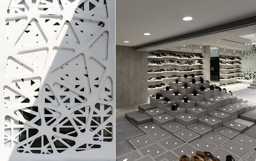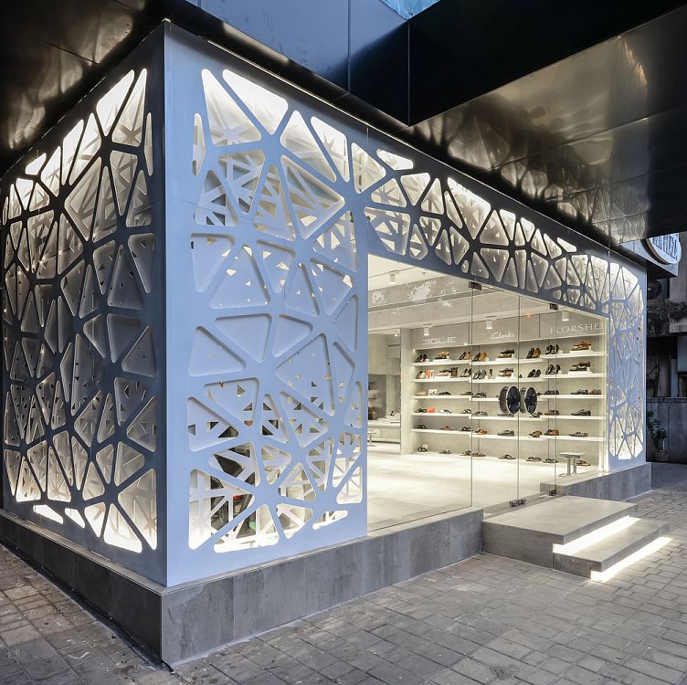Архитекторы бюро NUDES завершили работу над проектом магазина Regal Shoes в Мумбаи, Индия. Фасад бутика имеет слоистую структуру: через треугольные отверстия внутрь проникает естественный свет, создавая замысловатые узоры из света и тени внутри магазина.