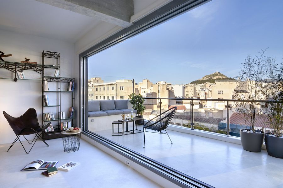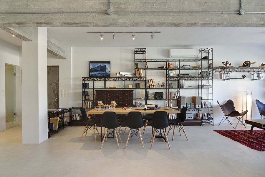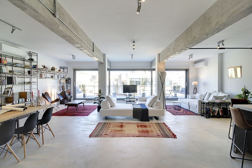Во внутреннем пространстве лофта практически отсутствует декор, зато преобладают чистые металлические, бетонные и деревянные поверхности. Среди интерьерных объектов много винтажной мебели, напоминающей о том, что это место «с историей». Стеклянный фасад пропускает внутрь много света и обеспечивает хороший обзор. Лофт разделен на зону дневного пребывания (кухня, столовая, гостиная, кабинет) и приватную зону (спальни и ванные комнаты). Зонирование осуществляется при помощи стеклянных и металлических раздвижных дверей, а также черных занавесов. Благодаря мобильному кухонному острову и занавесам внутри гостиной может быть выделена временная гостевая комната.