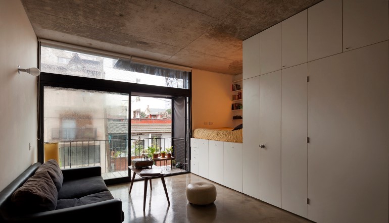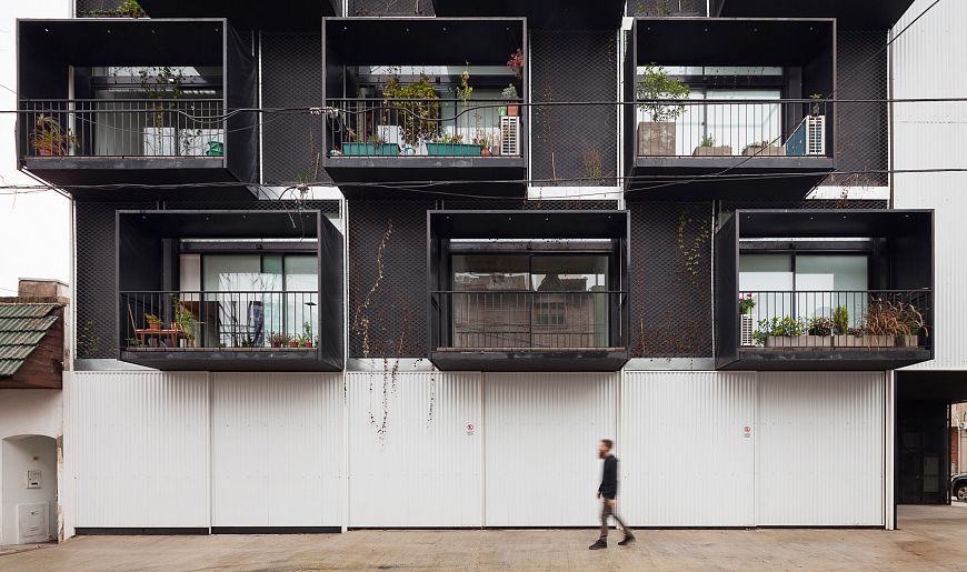Проект Quintana 4598 (Аргентина) представляет собой модульную структуру из 12-ти квартир. Каждая обозначена выступающим консольным объемом – балконом.