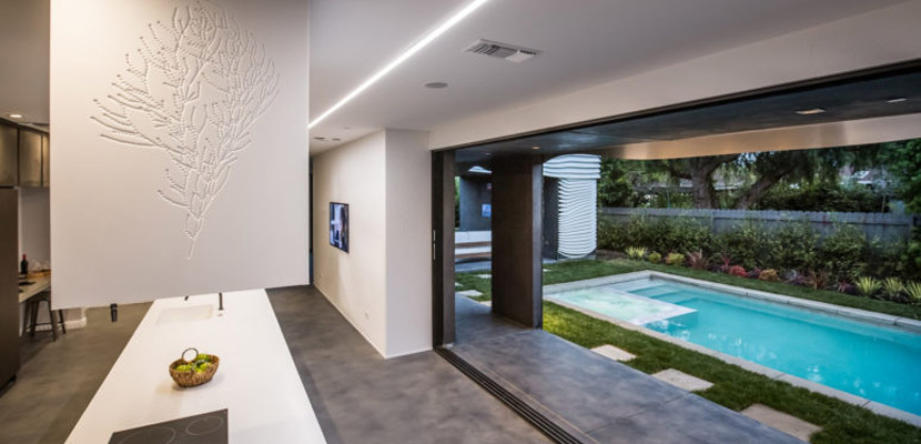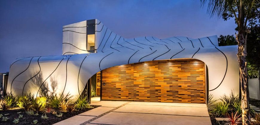 Проект оригинального дома вдохновлен морем, его волнами и изменчивостью. Пространство, архитектура строения, - все навеяно морской стихией. Внутри мы находим современные и достаточно простые пространства, не отвлекающие от архитектуры. Волны здесь повсюду. В ходу асимметричные рисунки, однако, они очень гармоничны. Прямые линии контрастируют с извилистыми кривыми. Внутри строения использован минималистский стиль, разбавленный оригинальными яркими акцентами. Большие окна кухни «раскрываются» на бассейн. В столовой внимание привлекает деревянный стол в винтажном стиле. В спальне спокойную гладь бело-голубых морских оттенков «ломает» ярко-красный стул, который, несомненно, должен ассоциироваться с кораллами.