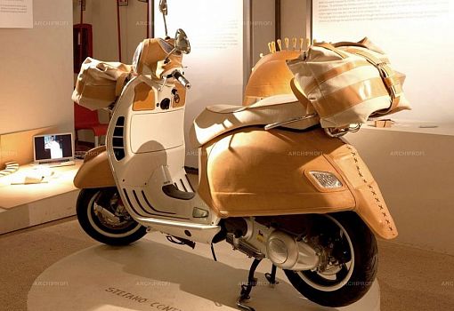 до сих пор остается как популярным средством передвижения, так и объектом творческих экспериментов художников и дизайнеров. На Milan design week свою версию культового мотороллера представил Стефано Контичелли (Stefano Conticelli) – дизайнер и мастер ремесленного производства из Умбрии. Контичелли работает с натуральными «народными» материалами – деревом, кожей, фетром, тканью, кашемиром – адаптируя к современной стилистике проверенные временем традиционные ремесленные технологии. Давняя любовь к лошадям подсказала автору идею создать эксклюзивного современного «скакуна», что и было воплощено в проекте ComplicitàStatiche: это скутер Vespa последнего поколения, обтянутый высококачественной дорогой кожей. Шикарная, элегантная и немного ироничная «лошадь с мотором» впечатлила даже избалованных завсегдатаев Недели дизайна. «Мотолошади» изготавливаются лимитированной серией и существуют в считанном количестве экземпляров. Облик модели дополняют аксессуары из кожи и плотной хлопковой ткани.
