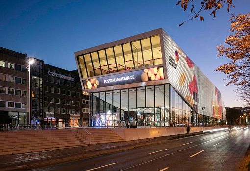 Еще в сентябре 2011 года был объявлен конкурс на лучший проект нового немецкого музея футбола. К участию приглашались архитекторы со всей Европы. Победа досталась архитектурному бюро HPP, которое на языке архитектуры и дизайна сумело лаконично раскрыть основную тему: «Мы – футбол». И вот проект реализован. Открытие музея состоялось в этом году. Коробка здания имеет клиновидный вырез, формирующий непрерывное пространство и придающий строению динамику и открытость. Масштабное остекление выставляет на обозрение внутреннее пространство двух этажей, а фасад из перфорированного металла может быть использован в качестве фона для любых футбольных тем. Посетители выставки получают возможность увидеть современные интерактивные и мультимедийные экспонаты, позволяющие почувствовать живой футбольный матч во всей красе. Общая концепция музея подчеркивается гигантским телевизором с плоским экраном на переднем фасаде.
