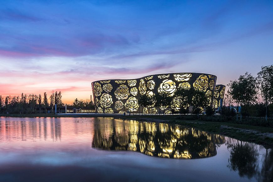 Первый в мире музей, посвященный розам, открылся в Пекине. Над проектом здания трудилась голландская архитектурная студия Next architects. Изюминкой музея роз стал стальной фасад здания, перфорированный узором из цветков розы.
