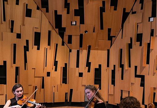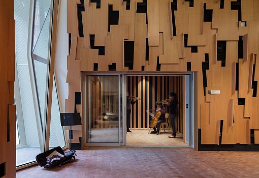 Внутренние поверхности включают специальные деревянные перегородки из дерева, позволяющие влиять на силу звука. Помещения центра создают ощущение пребывания внутри музыкального инструмента. Большой зал для репетиций предназначен в том числе и для оркестровых репетиций, но при этом остается по сути камерным пространством, которое может быть использовано для индивидуальных и групповых занятий.