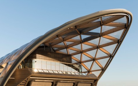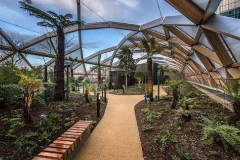 Общественная функция в виде сада, магазинов, ресторанов и кафе на крыше станции Кенери Уорф (Лондон) уже стала доступной для широких масс, сама же станция будет открыта только в 2018 году. Архитекторы Foster + Partners создали 300-метровое сооружение с полукруглым металлическим каркасом – он служит основой, на которую крепятся стеклянные и пластиковые элементы (подушки, наполненные воздухом) треугольной формы. Частью системы являются 1418 деревянных балок, имеющих 564 узла соединения. Общая площадь сооружения высотой 28 м равна 34837 кв.м.