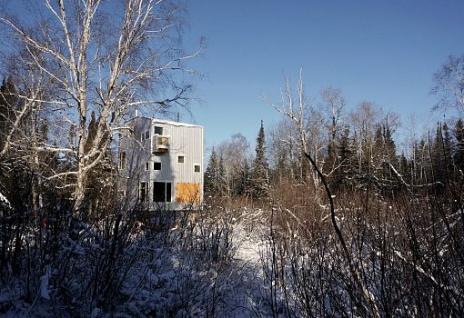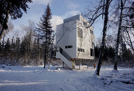 Дом Pole House от студии DIN Projects установлен на сваях из вторично использованных газовых труб. Элементы конструкции забурены глубоко в известняк, чтобы обеспечить ее устойчивость. Внешняя обшивка выполнена из металла, что контрастирует с уютным интерьером из натуральной древесины. Форма минималистского концепта неслучайна и позволяет максимально улучшить теплоизоляцию.