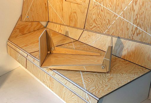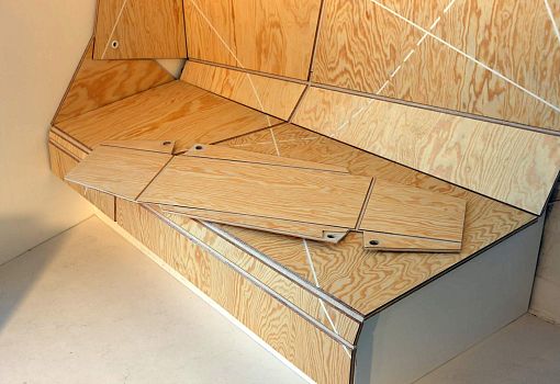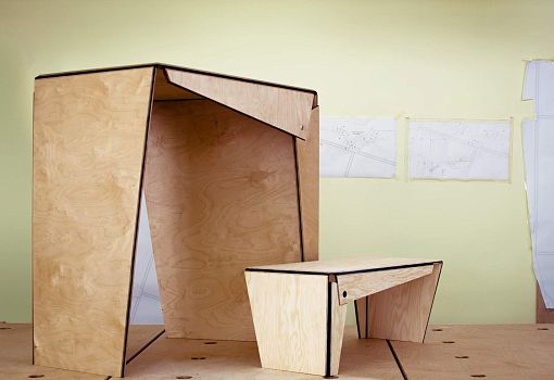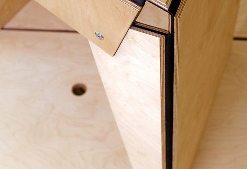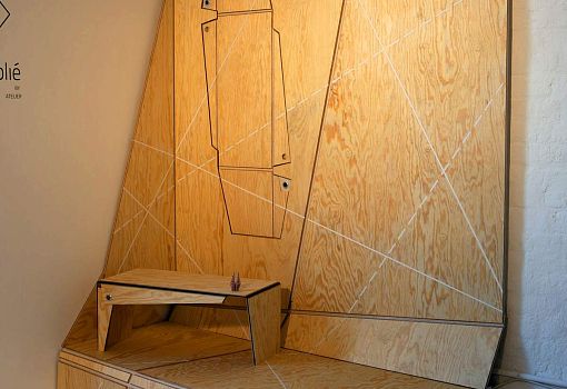 Коллекция Plie (два стола, тумба и табурет) – результат двухлетних технологических экспериментов студии atelierarchitects, которую возглавляет Гергей Киш-Гал (Gergely Kiss-Gal). Название коллекции (от фр. «plier» - «складывать, сгибать») отражает суть процесса: мебель выкраивается из плоского листа и складывается по сгибам. Лист – специально разработанная ламинированная слоистая панель - гибкая, но прочная комбинация из нескольких пластов различных материалов.