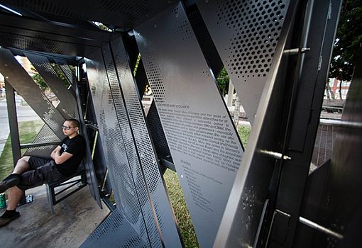 Новый проект бюро Asteriskos доказал, что даже обычная остановка автобуса может иметь серьезный социальный подтекст. Так, Memorial Transit Shelter стала еще и мемориалом Мери О'Коннор (скандальная певица и композитор). В целом композиция представляет собой хаотично пересекающиеся перфорированные экраны, обернутые вокруг металлического каркаса. В сооружении прослеживаются как минималистские, так и индустриальные мотивы. Лицо певицы изображено при помощи перфорации. Расположена остановка в городе Темпе (Аризона, США).