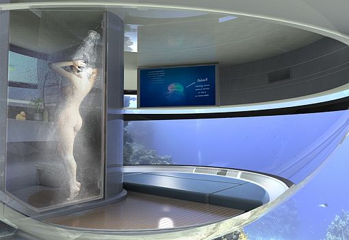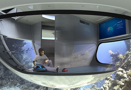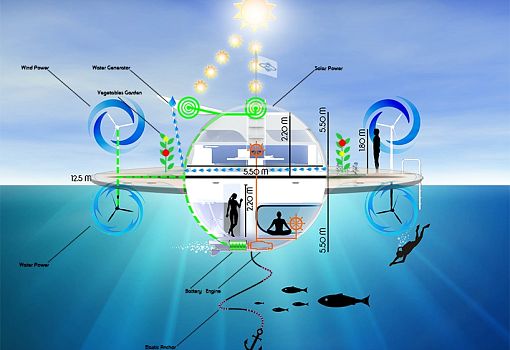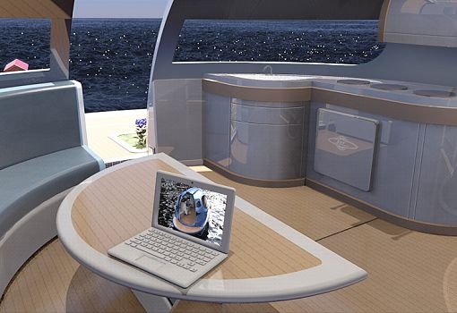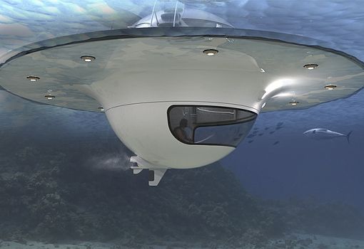 Итальянская водотранспортная компания Jet Сapsule представляет свой новейший мореходный концепт – «НЛО». Это гибрид яхты и коттеджа. Плавучий объект, напоминающий блюдце, представляет собой автономный энергетический контейнер, использующий природную энергию. Для этого на морском «НЛО» установлены ветряки и солнечные батареи. За счет полученной энергии судно способно развивать скорость до трех узлов (3,5 морских мили в час). Размер необычной яхты - 12,5 м в диаметре и 4,4 м в высоту. Для комфорта пассажиров имеются две жилые зоны, отделенные от внешней палубы. На судне имеется все необходимое для жизни, в том числе мини-кухня и душевая. На нижнем уровне пассажиры смогут насладиться видами подводного мира.
