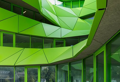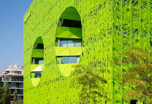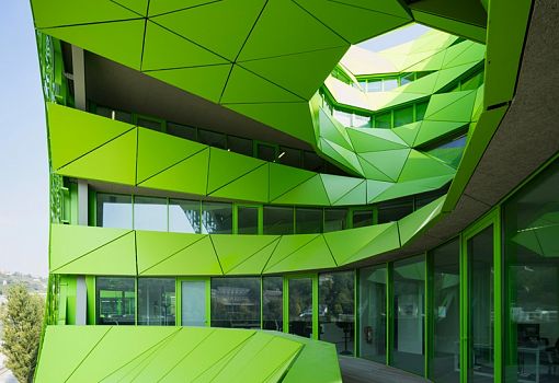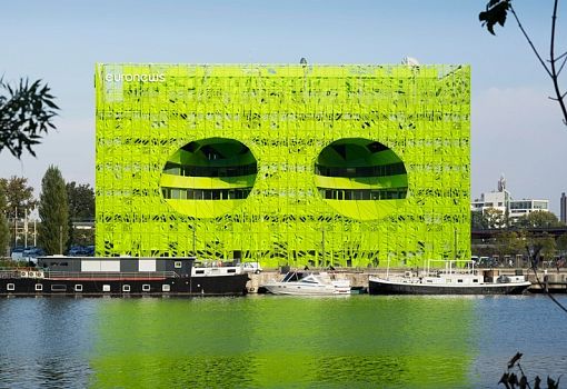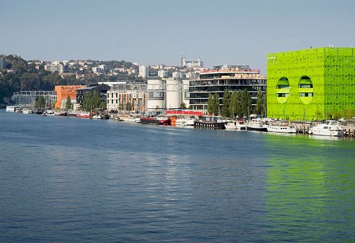 Архитектурная студия Jakob + Macfarlane завершила работу над созданием новой штаб-квартиры «Евроньюс» во Франции. Здание ярко-зеленого цвета возвели на берегу реки Соны в Лионе. Зеленый куб стал частью проекта реновации причала Рамбо, направленной на обновление района Конфлюэнс в Лионе. В рамках этого преобразования студия Jakob + Macfarlane запланировала построить два необычных здания, первое из которых, оранжевый куб, завершено в 2011 году, а второй – в 2015.