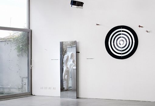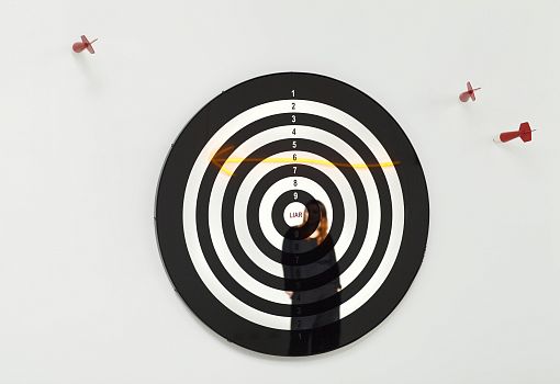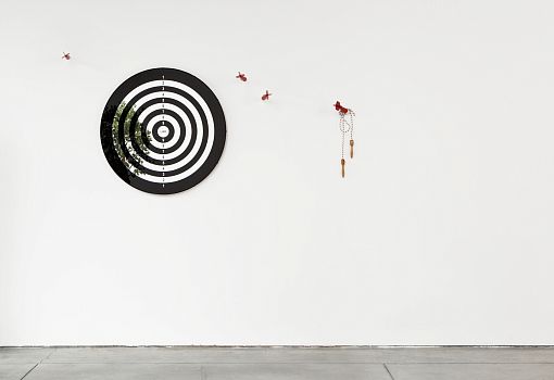 Комплект Bull’s Eye (снабженный подзаголовком «Высокомерие») состоит из круглого зеркала в виде мишени (принт на зеркальной поверхности) и воткнутых в стену дротиков для подвешивания одежды и аксессуаров. А в самое яблочко большими красными буквами впечатано слово «лжец» (liar).