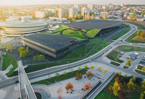 Новый проект Международного конгресс-центра стал объединяющим элементом застройки исторического центра и площади в Катовице (Польша). Архитекторы JEMS Architekci создали многофункциональное сооружение, ставшее ориентиром и символом города. В композиции обыграны природные ландшафты, представленные в виде череды озелененных площадок. Здание, оформленное в темных цветах, контрастирует с динамичными зонами озеленения.