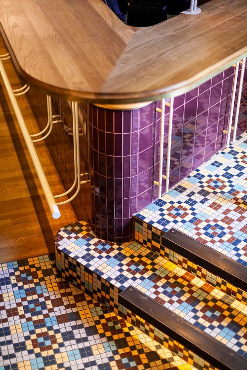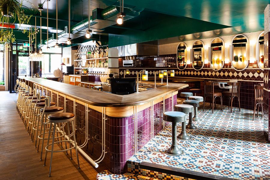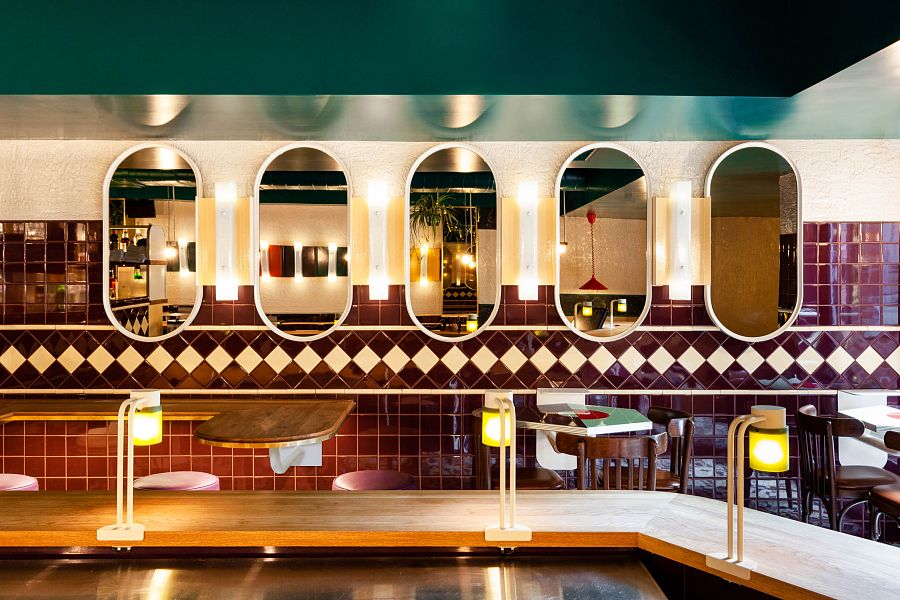 Любопытно, что плитка используется для визуального разграничения функциональных зон. Так, цоколь центральной скругленной барной стойки облицован плиткой винного цвета. А дальняя часть бара отделана пестрой узорчатой плиткой. Архитекторы искали интерьерные объекты для нового заведения в антикварных магазинах, на ликвидационных распродажах, в Интернете у коллекционеров. Например, стойка бара когда-то была старинным комодом с травертиновой столешницей. Емкость для охлаждения вина — огромной промышленной раковиной из нержавеющей стали. А разноцветные фонарики в свое время освещали старый склад.