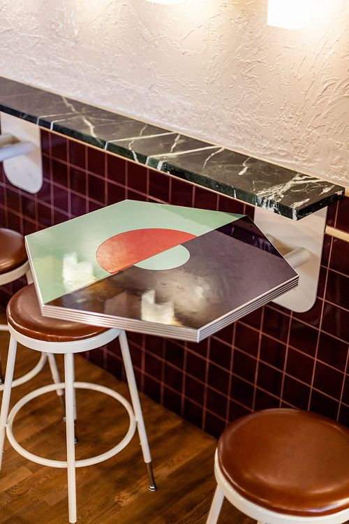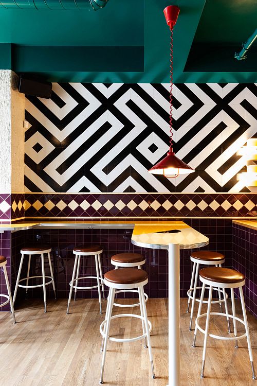 Работа над концепцией началась с дегустации вина, во время которой архитекторы обратили внимание на фирменную наклейку на бутылке, демонстрирующую гармоничное сочетание ярких цветов и нескольких графических паттернов. Все они были созданы при помощи компьютерной технологии CNC. Тут то и понадобилось воображение, позволившее авторам представить все внутреннее убранство заведения площадью 153 кв.м в виде гигантского лейбла. Такие детали, как шестиугольные столешницы, декор в виде лабиринта на стенах, пестрый узор плитки на полу, появились благодаря «дорисовыванию» винной этикетки.