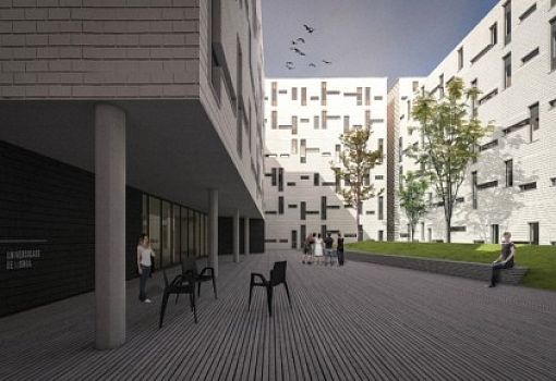 На проектирование нового общежития для студентов университета Polo da Ajuda в Лиссабоне был проведен конкурс. Победителем его стало бюро CVDB Arquitectos, которое предложило проект из трех композиционно связанных корпусов, расположенных вокруг открытого внутреннего двора. Первое, что бросается в глаза - это асимметричные узкие оконные проемы зданий, демонстрирующие гармоничное сочетание горизонтальных и вертикальных линий. Фасады будущего общежития характеризуются угловым остеклением.